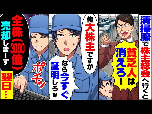 【スカッと】清掃員の服で株主総会に行くと「貧乏人は帰れ!」俺「大株主ですけど?」「なら今すぐ証明してみろw」→全株(3000億)即売却した結果【漫画】【漫画動画】【アニメ】【スカッとする話】【2ch】